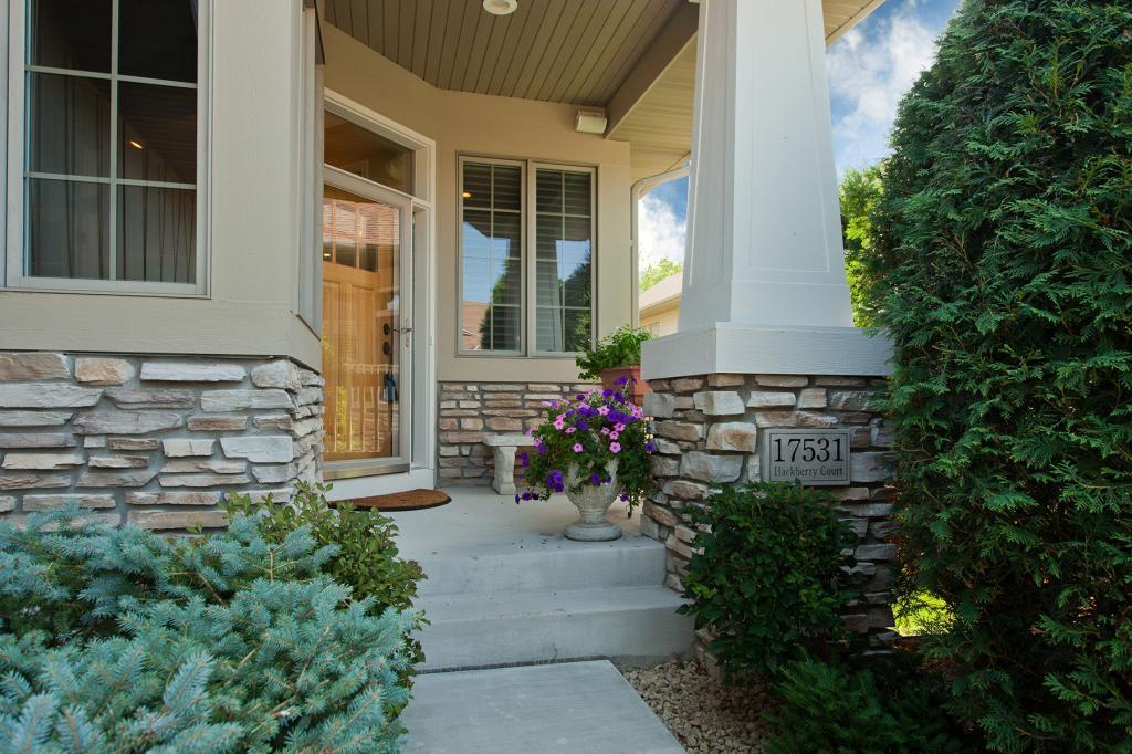 Superbly detailed & maintained 3BR villa home. Private covered entry. Main level master suite, plus study, kitchen with generous storage, knotty alder cabinets, ID bar & breakfast area, open to great room with gas fplc & extensive built-ins. DR with built-in buffet. Sunroom opens to deck plumbed for gas grill. Mudroom, main level laundry, powder room. Lower level w/2BR, bath, family room w/gas fplc, media center, slate floored bar. Good storage. Hickory hdwd floors on main, security system.