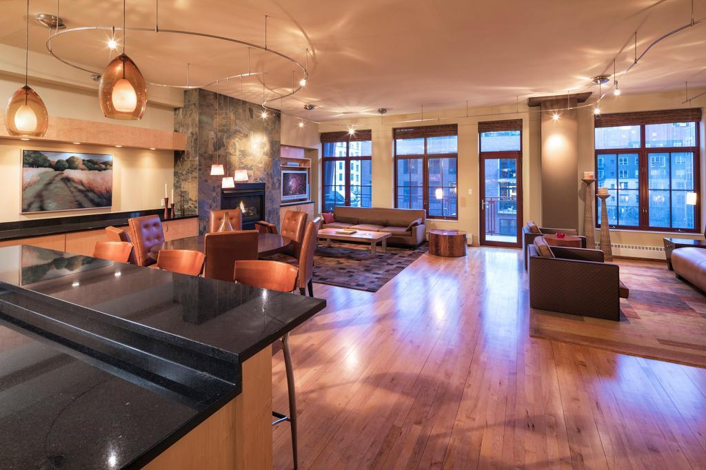Outstanding Stone Arch Lofts 2BR + den with terrific southern exposure and skyline views. Expansive great room with fireplace and hardwood floors opens to center island kitchen. Walk in pantry/laundry. Generous master suite with walk in closet and full bath with dual sinks. Guest BR with Murphy bed. Den/office with custom built-ins and storage. Balcony with gas connection for grill. Sound system. Excellent in-unit storage. 2 garage spaces plus storage room. Superbly maintained. Shared amenities include rooftop deck, grill and kitchen; main level conference room, lounge and kitchenette; fitness room, bicycle store room. Lobbies off 2nd Street and on river side guest parking area.