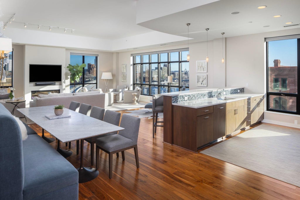 Stunning views overlooking the Mississippi River through a 14-foot wall of glass from this corner loft condo with 11-foot ceilings! At 1,830 SF, this 2-bedroom, den/nook, 2 bath, large loft-style home is extremely rare for the premier Carlyle Condominium. Enjoy the rare, private, 10.5 x 25.5 ft 1-car garage, plus 1 additional parking space, 2 wine lockers, and storage. Open kitchen features upgraded Monogram and Viking appliances and quartz countertops. High-ceilinged primary suite includes walk-in-closet and gorgeous marble tiled full bath. The second bedroom includes a wall of built ins. In unit laundry. Easy access to your parking spaces and amenity deck with grills, pool and club room – all just 1 stair flight or elevator ride away! Carlyle features updated common areas, 5th floor fitness/yoga center, pool, hot tub, 3 guest suites, & more. The Carlyle offers 24-hr front desk attendant, a wonderful community and lifestyle.