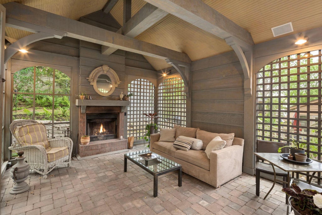 Prime Bryn Mawr location with 2-car attached garage, sits this charming home, Tucked away, like a retreat. Nestled under a treed canopy, you are transported to a restful place via a magnificent, vaulted 3-season porch with woodburning fireplace and access to the waterfall feature, hillside gardens and gravel terrace. Inside, enjoy updated spaces that continue the storybook charm. Large, open kitchen with stone countertops and white cabinetry connects with dining and living spaces, and to the outdoor spaces. Main floor also includes office/den and powder bath. Upper-level private primary suite with 2019 full bath addition with double vanity, private commode, soaking tub and glass shower! Enter on ground level from the side entry, or from your attached 2-car garage with coated floor. Ground floor offers 2 cozy bedrooms, laundry and ¾ bath. New roof in 2023, new AC and water heater in 2024. Updated, and added onto by a known Interior Designer, this home delivers on charm and is easy to fall in love with.