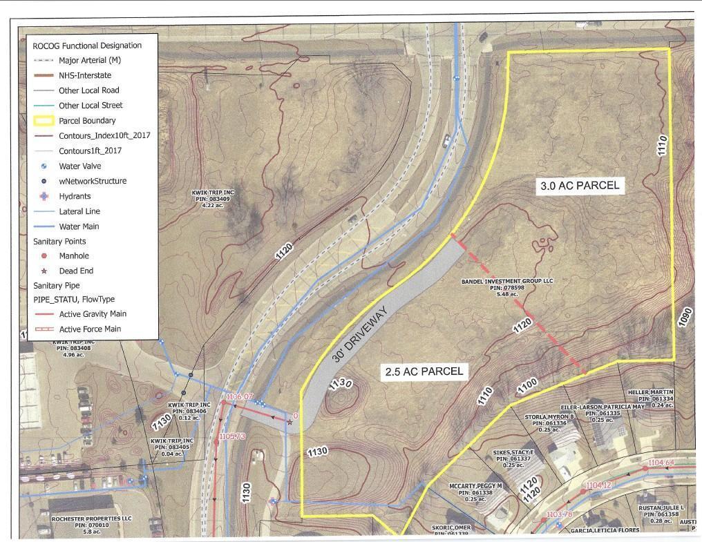 Outstanding NW Rochester Commercial Building site with 5.5 ac. Great access to HWY 52 and great access off Bandel Rd directly access from Kwik Trip for added traffic count. Land can be split into 2 or up to 5 parcels. Map shows a possible 2 parcel split.