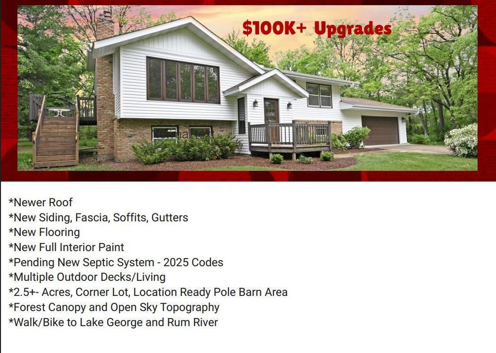 21414 Tulip Street, where a custom-built split-level farmhouse named ‘White Pine’ invites you to stay and embrace its unique architectural allure - where you feel a nudging that says ‘stay awhile’. Aptly named ‘White Pine’ after the the iconic 150 ft tall White Pine trees on the property, this house embodies purposeful architectural design in both size and multiple living areas. The abundant and purposeful spaces within White Pine, open the doors to a truly exceptional family living experience. Given the powerful nature presentations of the land, the split-level elevation allows for amazing indoor/outdoor access. The elevated main living floor was designed to provide multiple spaces to enjoy the outdoors from the interior with elevated views. 2 living areas and 2 dining areas anchored in over-sized picture windows capture the indoor/outdoor experience - presenting 360 degrees of nature panorama. The attached 3 outdoor decks extend the living spaces. White Pine’s kitchen is placed in the center of the main living floor to provide connectivity. Dressed out in classic white solid wood cabinetry, White Pine’s kitchen successfully plays its role in elevated living with style and functionality. Adding to White Pine’s farmhouse warmth are new honey walnut vinyl planks throughout the main and lower levels. White Pine’s purposefully designed living with 5 bedrooms and 3 baths spread across three floors. Two primary retreat suites feature sitting areas, en-suites, and walk-in closets, ensuring privacy. The lower split level includes a 3rd family room for cozy gatherings by the fireplace, two more bedrooms, laundry, utility space, and a full bath. White Pine’s most prized feature is its expansive land, highlighted by the 150 ft+ majestic White Pine trees across 2.5 +- acres of forest canopy and open sky space. This unique blend of flora and fauna provides an ideal setting to live at the center of Minnesota’s outdoor best at a place called, White Pine of Oak Grove.