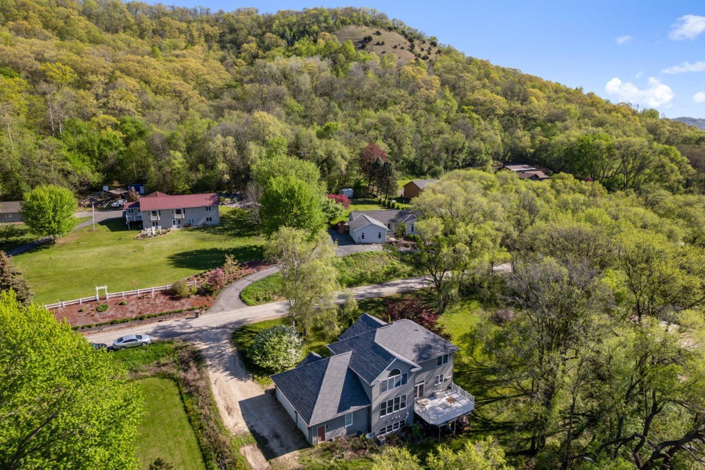 Welcome to this beautiful 6-bedroom, 4-bathroom home, perfectly positioned to offer breathtaking views of the Minnesota bluffs and the Mississippi River Valley. Located just 6 minutes from Winona, this property combines luxury, comfort, and convenience. Step inside to a grand foyer and an open-concept main floor featuring soaring 9-foot ceilings, gleaming oak floors, and solid oak doors. The kitchen, dining, and living spaces flow seamlessly together, centered around a stunning gas fireplace that adds warmth and charm. Step outside onto the maintenance-free metal deck, perfectly placed to take in the stunning panoramic views- an ideal space to relax or entertain. The upper level boasts four spacious bedrooms, including a private master suite complete with vaulted ceilings, a large walk-in closet, and a luxurious bathroom featuring a jetted tub. The lower level offers incredible flexibility with two additional large bedrooms, a walkout family room perfect for entertaining, and ample storage space. Practical features include a convenient main-floor laundry room and a heated, insulated three-car attached garage — ideal for garage enthusiasts. Enjoy the best of both worlds with a peaceful, picturesque setting and easy access to everything the area has to offer. This home is truly a rare find!