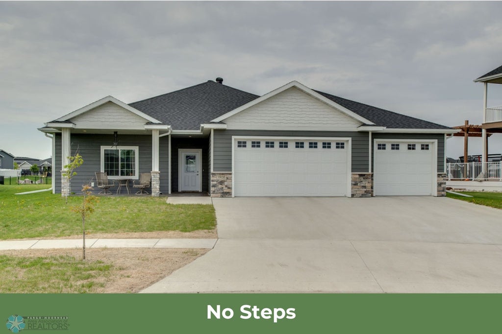 No Backyard Neighbors + Cul-de-Sac Privacy! Beautifully designed slab home in Fargo’s Crofton Coves, just minutes from 52nd Ave amenities. HUGE heated 3 stall garage w/floor drain! Luxury finishes throughout! 9ft ceilings w/in floor radiant heat allows for luxurious main level living! Enjoy a smart split-bedroom layout with the private primary suite on one side & two additional bedrooms on the other. The kitchen impresses w/ ample storage, a walk-in pantry, granite counters, coffee bar area, gas range w/pot filler & spice drawer pull out! Opens to a spacious living room w/ tray 10 ft ceiling & a cozy stone hearth. A bright sunroom overlooks the private yard & patio—perfect for relaxing or entertaining. Primary suite features a tile shower, double sinks, walk-in closet, & laundry access through the large functional mudroom! SO much to LOVE about this home, it's a must see in person! STOP clause in effect.