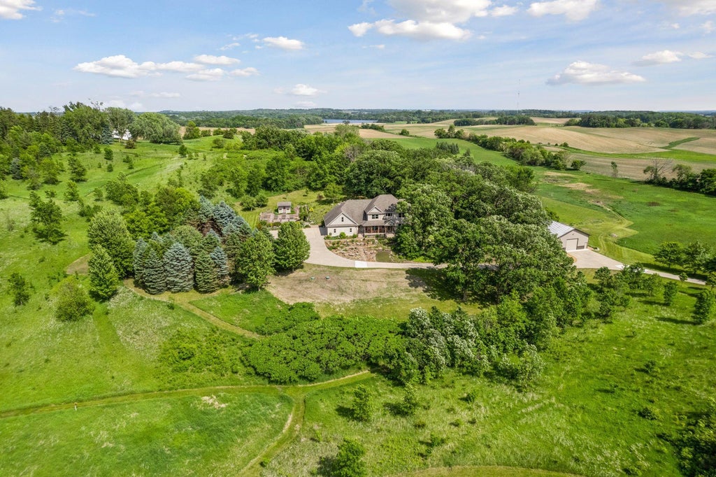 Now available for the first time… 11905 Market Avenue in Cologne. This remarkable 38-acre property impresses with three ponds, rolling hills and truly breathtaking landscape. It showcases masterful gardens with fragrant blooms of perennials and natives with vibrant color all-season long. A potting shed offers charm and caretaking convenience to the grounds next to the vegetable and herb garden. There is a sprawling patch of strawberries and raspberries, as well as apple, pear and plum trees. Enjoy tranquil sounds of the pondless waterfall from several outdoor spaces. Find sanctuary on the three-season porch, admire wildlife from the covered front porch and entertain on the patio or Trex deck. Step inside the home to reveal a gorgeous main level with a comfortable layout and quality craftmanship. Gleaming hardwood floors lead into a sun-filled kitchen with both formal and informal dining space. The adjoining mud room houses convenient laundry, a half bath and abundant storage in the pantry. A handsome gas fireplace is anchored in the family room offering lush views framed by many windows. The front sitting room offers versatile use and more views. Head upstairs to find three bedrooms and two bathrooms on this level, with the inclusion of the primary suite. You will love this private retreat and its spa-like bath with a double vanity, jetted tub and large walk-in closet & shower stall. There are two bonus rooms above the garage that welcome any use but have made for wonderful home offices. The lower level entertains with a cozy wood-burning fireplace, a beautiful custom bar and walkout access in the family room. There is another bedroom, flex room and ¾ bathroom on this level with in-floor heat throughout. Other notable upgrades include maintenance-free steel siding, a heated & insulated 3-stall garage with epoxy flooring, fiber optic internet, invisible fencing and a BRAND-NEW septic system and 40x60 Pole Barn installed in 2024. There are 16 acres currently enrolled in the CRP program with ability to be transferred to the new owner. Hunting enthusiasts will appreciate the custom deer stand and the panoramic views of these prairies. The peaceful life you’ve been searching for has FOUND YOU!
