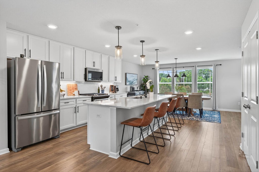 Welcome to this meticulously maintained end-unit townhome in the heart of the esteemed Mounds View School District. Built in 2021, this home features upgraded kitchen appliances, quartz countertops, soft close cabinets, in-home humidifier, 10 ft island, abundant natural light, elegant window treatments, upgraded light fixtures, and a custom built-in bedroom closet. The layout is ideal, with all 3 bedrooms on the same level and a lower level living room that could easily be converted to a fourth bedroom. The open-concept main level is centered around an expansive dining area which overlooks stunning views of the community’s professionally maintained shared areas. The front steps open up to abundant green space, walking paths and an impressive playground - perfect for families of all ages. You'll be just minutes away from Long Lake, Hansen Park, restaurants, coffee shops and community center. The location is unmatched with easy access to highways 694 and 35W offering a 20 minute commute to Minneapolis or St Paul. This charming, low maintenance home is a must see! Agent is related to the sellers.