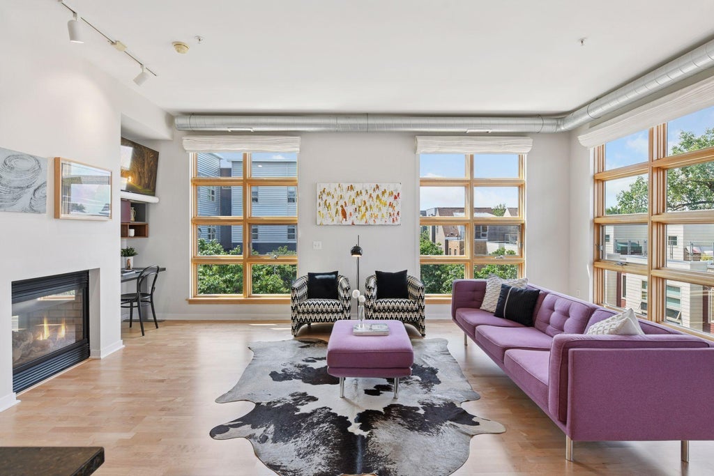 Experience modern urban living at its finest in the award-winning Midtown Lofts, ideally located in the heart of Uptown. This stunning west and north-facing corner unit offers unparalleled convenience, just steps from lakes, parks, dining, shopping, and public transit. Natural light pours in through expansive walls of oversized windows, complementing the soaring 10-foot ceilings that create an open, airy atmosphere throughout. The huge center island kitchen boasts granite countertops, stainless steel appliances, and plenty of prep space, making it perfect for entertaining or daily use. A two-sided gas fireplace enhances the living area and primary bedroom, adding warmth to both the public and private spaces. The second bedroom offers versatile potential as a den or family room. Numerous custom built-ins provide additional storage and functionality, including two great work-from-home desk/office spaces. Midtown Lofts offers a wealth of exceptional amenities, including a car wash station, bike racks, dog run, central courtyard with fountain, and a community garden. Eco-conscious living is highlighted by the development’s solar panels, promoting sustainability and energy efficiency. This unit also comes with two underground heated parking spots (#37 and #38). Discover luxury, sustainability, and the best of city living at Midtown Lofts. New HVAC and water heater in May 2023! Great homeowners association.
