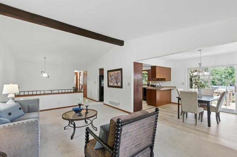 Welcome to this refreshed 3-bedroom home featuring fresh paint and new carpet throughout the upper level, which also includes a full bathroom for convenience. The main living room boasts vaulted ceilings that create an open, airy feel, while the kitchen has been refreshed with modern LVT flooring and a stylish new backsplash. The lower level offers a family room, a non-conforming bedroom also updated with fresh paint and LVT flooring, and a 3/4 bath. Step outside to enjoy the rear deck, ideal for relaxing or entertaining, and admire the curb appeal enhanced by newly built wooden steps and railing at the front entrance.