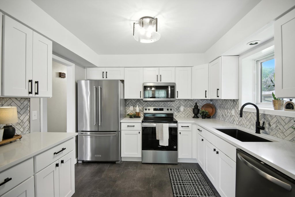 This home shines with fresh updates and inviting spaces at every turn! Step inside to find a bright interior with new paint, updated light fixtures, and fresh LVP and carpet throughout. The kitchen is a true showstopper, boasting new stainless steel appliances, soft-close cabinets, quartz countertops, and a stylish herringbone tile backsplash. Beautifully updated bathrooms add to the move-in-ready appeal, while the cozy family room with a brick fireplace is perfect for relaxing evenings. A sun-filled 3-season porch with walls of windows looks out to the semi-private backyard, offering the ideal spot for morning coffee or summer nights. Tucked on a quiet street with maintenance-free metal siding, this home blends comfort, style, and peace of mind—all in one cheerful package.