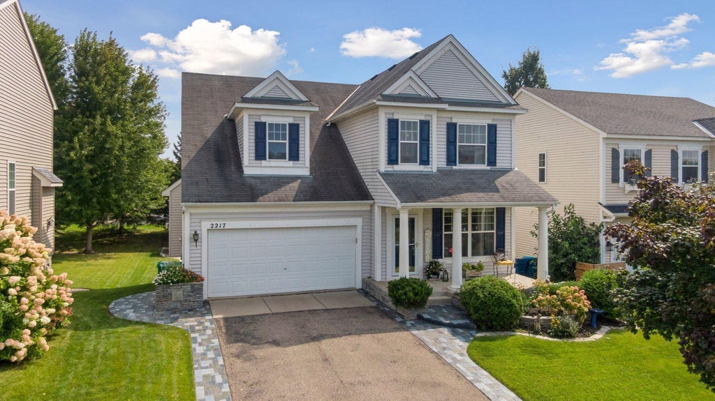 Bright and charming, this two-story with curb appeal has everything you need and more! Notice the cute front porch and then enter into two-story entryway that opens into living room with hardwood floors. Main floor living room is sunny and spacious. The dining room has space for large table and hutch. Flowing through into the kitchen you'll see stainless steel appliances, center island, and the informal dining area - all with easy access to your lovely two-tier deck overlooking your patio, firepit area, playset and shed. The large family room is anchored with a gas fireplace, mantel, and side built-ins. Main floor is rounded out with cute powder room and easy back hall entry to garage. Upstairs you'll find a private primary suite with walk- in closet and full bathroom (sporting two sinks). Two junior bathrooms - both sunny and cute - are also upstairs with a full bathroom located in the hallway right between them. Don't miss the very convenient upstairs laundry room. Downstairs is just fun, fun, fun. First, you'll find a great hobby area and built-in at the bottom of the stairs. Walk into your entertaining dream with a wet bar (microwave and refrigerator included), theater system, and amusement room. Can't you just imagine movie nights? The fourth bedroom is tucked in the corner and is presently a gym and kids' playroom. Lower level also has cheery three-quarter bathroom. Don't miss the amazing backyard - huge deck, patio, playing area, room to garden, and shed for storage. This home is connected to miles of walking/biking trails, tons of neighborhood and City parks, and easy access to Target, Costco, and more.