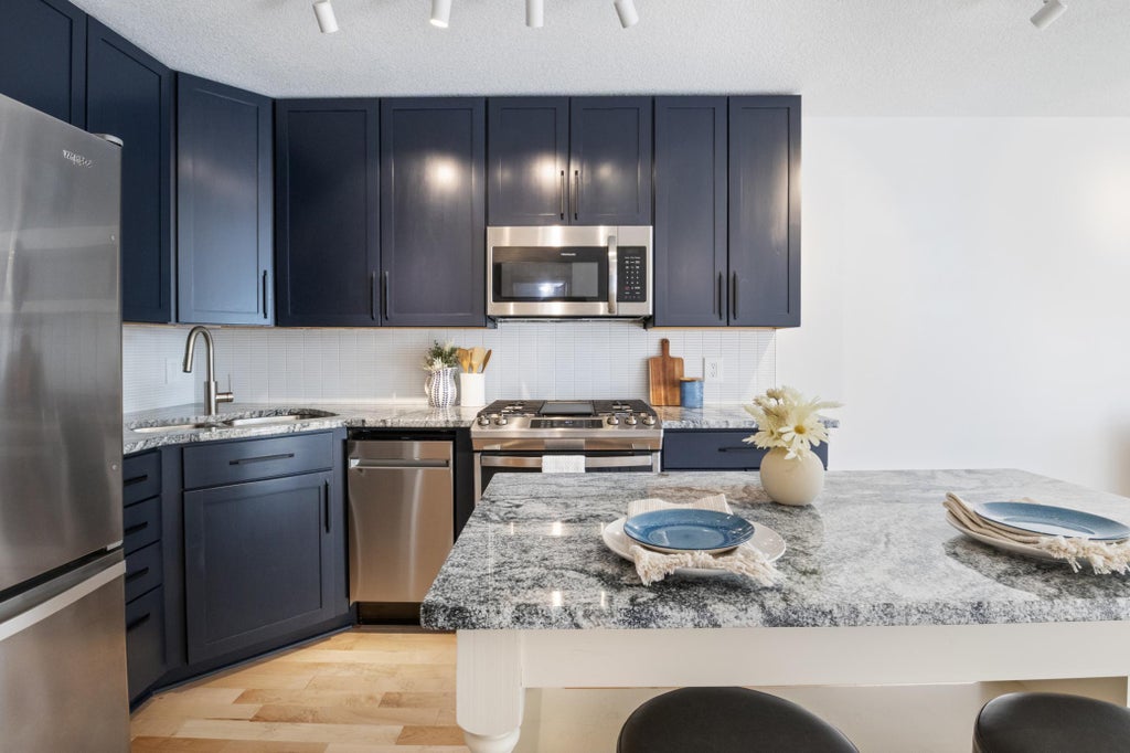 Welcome to this sleek and stylish condo that knows how to make an entrance! Gleaming hardwood floors and oversized windows fill the open layout with natural light. The kitchen is a showstopper with navy shaker cabinets, granite countertops, stainless steel appliances, and a modern tile backsplash. A corner sink, center island, and open flow into the living area make it perfect for cooking and entertaining. The spacious living room offers room to lounge and dine, while the large bedroom features mirrored closets and a calm, cozy vibe. The updated bath delivers spa-like style with a floating vanity, vessel sink, and tiled tub surround with accent detail. Added perks include an assigned parking spot, shared laundry, bike storage, and a garden courtyard retreat surrounded by greenery and flowers. Nestled on a tree-lined street just minutes from downtown Minneapolis, parks, and restaurants, this turnkey condo blends modern upgrades with urban convenience.