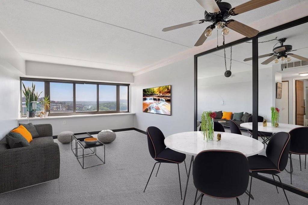 Outstanding Mississippi River views and a comprehensive, secure HOA are a winning combination for this affordable 1BR/1BA unit in a convenient location near the U of M, just steps away from the Mill District riverfront. The entryway with wainscoting detail includes handy coat/bag hooks to keep you organized. Open living/dining room (with brand new carpet!) with large mirrors reflect a light & bright feel. You'll appreciate the open plan featuring updated kitchen cabinets with raised breakfast bar in this right-sized home in the sky! Riverview Tower is an established condo community where Community living is comprehensive: great on-site mgmt. with 24-hr concierge front desk, monthly HOA includes all utilities, basic cable, internet, heated indoor pool, whirlpool, fitness room, sauna, outdoor patio with gas grills, tennis court, community rm w kitchen, package room, a car wash, bike storage room, and a free storage unit. NEW HOA policy as of June 2025, association is permitting rentals (with restrictions), and pets (dogs/cats with restrictions.) Plus, a decrease in monthly dues ($763.80/mo.) The building is tucked away near the U of M law school, easy access to downtown, the University area, highways to anywhere you want to go.