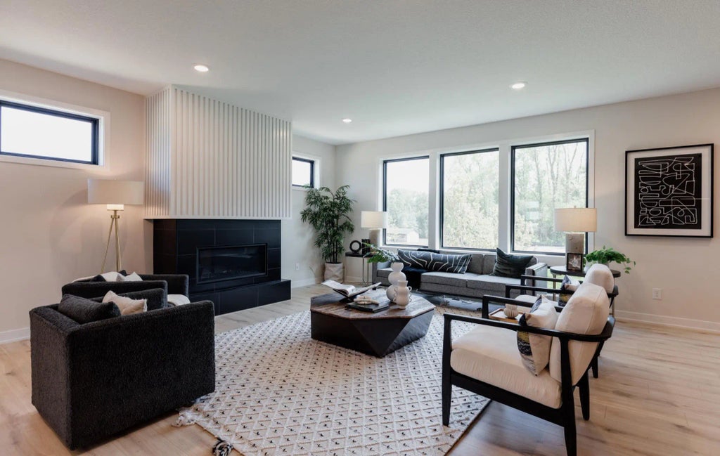 Quick Move-In – The Middleton in Northstar, Lake Elmo. Estimated completion late spring! Perfectly positioned at the back of the neighborhood, this home offers a rare wooded backdrop and a private, peaceful feel. Enjoy gorgeous sunset views from your composite deck, with Sunfish Lake just minutes away for year-round recreation and natural beauty. Inside, the Middleton showcases a gourmet kitchen with additional prep kitchen, open dining and great room, and a bright sunroom overlooking the trees. A main-level den provides flexible living space. Upstairs, the owner’s suite features a spa-inspired bath and oversized walk-in closet, while additional bedrooms include a dual-access suite and a private ensuite. The fully finished lower level offers a wet bar, recreation space, and guest bedroom—perfect for entertaining. Northstar Phase 2 has just 14 homesites remaining, with a future pool and clubhouse planned at the community’s iconic barn.