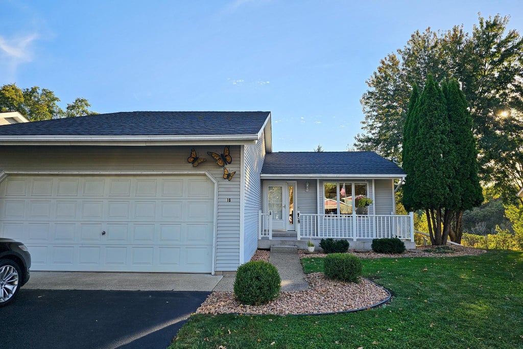 Welcome to this clean 3 bed / 2 bath one-story townhome tucked on a quiet no-outlet street with a private backyard offering great sunset views. Enjoy an open concept main level with vaulted ceilings, lots of windows, a spacious living room and kitchen with SS appliances & center island, a large primary bedroom with walk-in closet, PLUS a relaxing 3-season porch that overlooks the valley. The finished basement includes a cozy family room with wet bar, two additional bedrooms, a 3/4 bath, and a walkout patio door for easy access to the backyard and the covered concrete patio below the 3-season porch. Conveniently park inside the 24 ft deep attached two-car garage this winter. Outside you will find a lush lawn with ample space for gardening or play, beautiful landscaping, and a well-maintained driveway. Recent updates include a new roof, new 3-season porch windows and basement patio door, 1-year-old dishwasher, water heater, and washer. This is a great place to start a new chapter and enjoy peaceful small-town living. No monthly HOA fees. Owners split the cost of hazard insurance. Schedule a private tour today.